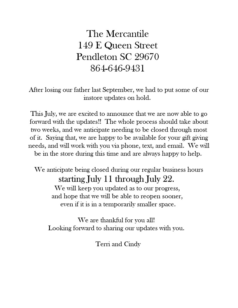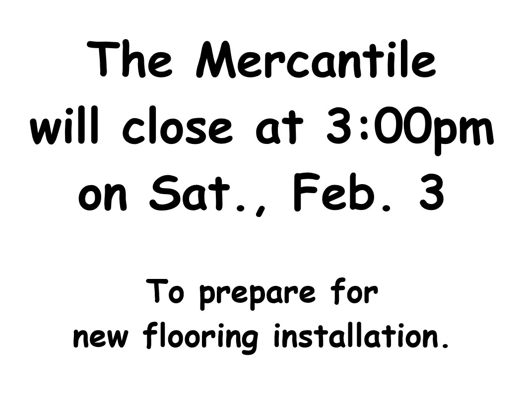 The Mercantile plans to remain open until 8:00 pm each of the Wednesdays. We will have some items on display out on the sidewalk, but lots more to explore inside.